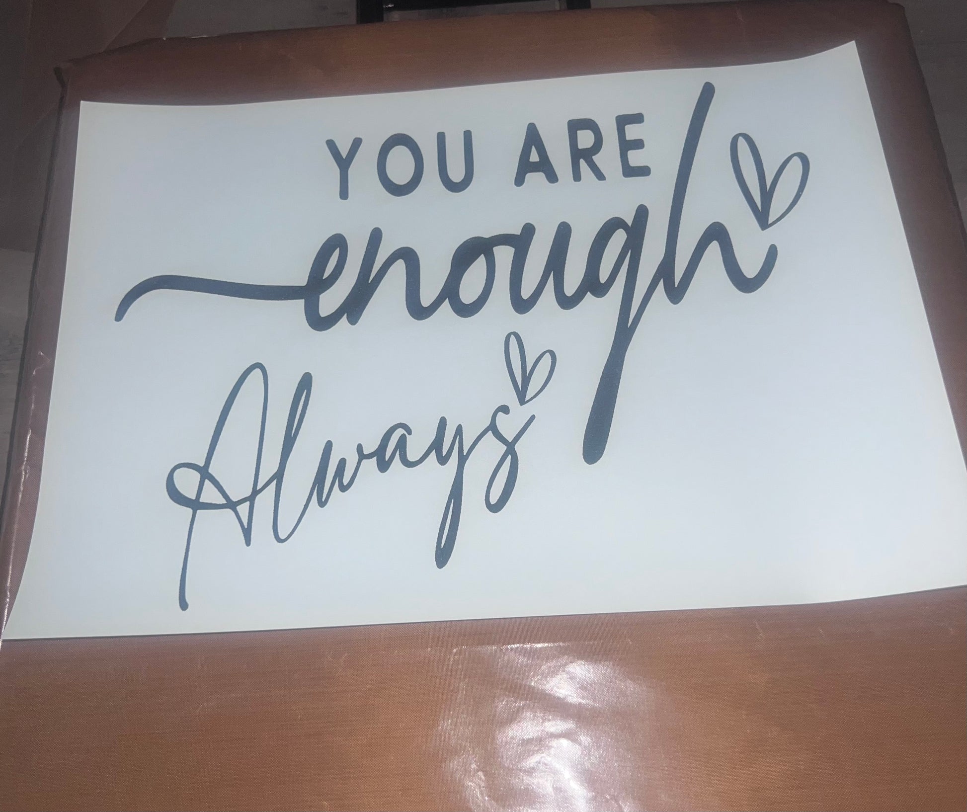 We suggest putting this print on a sweater, you are enough goes on the front & I cut out “always” to put it on the sleeve. Please clarify what you’d like in the note section at checkout!
